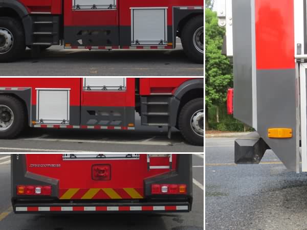 | 罐體總?cè)莘e:8.0立方米,水罐容積:5.85立方米,水罐尺寸:1735×2440×1450mm,泡沫液罐容積:2.15立方米,泡沫液罐尺寸:635×2440×1450mm。整體式側(cè)防護(hù)結(jié)構(gòu),后防護(hù)裝置材料:Q235,截面尺寸:120×120mm,與車輛連接方式:螺栓連接,后防護(hù)離地高度:400mm。ABS系統(tǒng)生產(chǎn)廠家及型號(hào)為:西安正昌電子股份有限公司(型號(hào):ZQFB-V)。主要專用裝置有消防泵、消防炮。 | |||