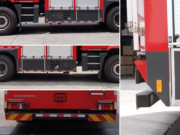 | 罐體總?cè)莘e為8.600立方米,水罐為“凸”字型罐,容積為6.550立方米,前端尺寸:1000×1500×1400mm,后端尺寸:1390×2440×1400mm,泡沫液罐容積為2.050立方米,泡沫液罐尺寸:1020×1500×1400mm。整體式側(cè)防護結(jié)構(gòu),后防護裝置材料:Q235,截面尺寸:120×120mm,與車輛連接方式:螺栓連接,后防護離地高度:410mm。ABS生產(chǎn)企業(yè)為浙江亞太機電股份有限公司,型號為APG3550500H1。主要專用裝置有消防泵、消防炮。 | |||