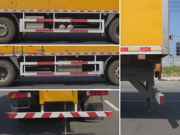 | 廂體頂部封閉,不可開啟;隨底盤選裝駕駛室;廂體側(cè)面選裝開門型式和位置;選裝瓦楞板機(jī)構(gòu)廂體以及開門型式和位置,選裝后部雙拉桿結(jié)構(gòu);選裝起重尾板,尾板質(zhì)量為550kg,起重尾板收起狀態(tài)水平長度為290mm;該車型可選裝ETC車載裝置;額定載質(zhì)量(kg)/整備質(zhì)量(kg)/準(zhǔn)乘人數(shù)(人)對(duì)應(yīng)關(guān)系為:20070/11800/2,20005/11800/3,20520/11350/2,20455/11350/3;運(yùn)輸**容器(瓶)包裝的貨物;危險(xiǎn)貨物類項(xiàng)號(hào):3;該車為危險(xiǎn)品貨物運(yùn)輸車;僅采用前輪盤式制動(dòng)器,前置排氣管,子午線輪胎,限速裝置的底盤,限速80km/h;后軸為空氣懸架;轉(zhuǎn)向輪安裝爆胎應(yīng)急防護(hù)裝置;發(fā)動(dòng)機(jī)/油耗申報(bào)值(L/100km)對(duì)應(yīng)關(guān)系為:MC07.31-60/38.0,MC07.34-60/38.0,MC09.35-60/38.0,MC09.38-60/38.0,MC09.35B-60/38.0,MC07H.35-60/38.0;該車安裝具有衛(wèi)星定位功能的行駛記錄儀;ABS系統(tǒng)**器生產(chǎn)企業(yè)/型號(hào)為威伯科(上海)管理有限公司/4460046300;選裝EBS,EBS系統(tǒng)**器生產(chǎn)企業(yè)/型號(hào)為威伯科(上海)管理有限公司/EBS3;側(cè)面防護(hù)及后下部防護(hù)裝置材料材質(zhì):Q235,連接方式:焊接;后下部防護(hù)裝置斷面尺寸(寬×高):60×120(mm),離地高度:460mm.選裝圓形后防護(hù),連接方式:焊接加螺栓連接;斷面尺寸(直徑):120(mm),離地高度:460mm. | |||