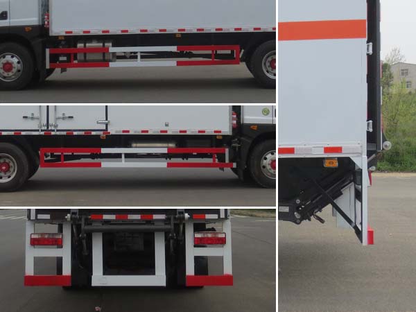 | 廂體頂部封閉,不可開啟;隨底盤選裝駕駛室;選裝燃油箱,電瓶,尿素罐,儲氣筒左右安裝位置.起重尾板為選裝件(收起狀態(tài)水平長度為290mm),尾板質(zhì)量為545kg;選裝不同廠家尾板及尾板樣式;廂體側(cè)面選裝開門型式和位置,選裝不帶側(cè)開門;選裝瓦楞板結(jié)構(gòu)廂體及開門型式和位置;選裝后部結(jié)構(gòu);額定載質(zhì)量/整備質(zhì)量(kg)對應(yīng)關(guān)系為:10700/7105,9995/7810;該車用于運輸具有**容器(瓶)包裝的危險品貨物類項號:3;僅采用前輪盤式制動器,前置排氣管,子午線輪胎,限速裝置的底盤,限速80km/h;后軸為空氣懸架;轉(zhuǎn)向輪安裝爆胎應(yīng)急防護(hù)裝置;發(fā)動機B6.2NS6B230,D4.5NS6B220,YCS04200-68,CY4SK761油耗申報值均為26.6L/100km;該車安裝具有衛(wèi)星定位功能的行駛記錄儀;EBS型號:EBS/ESC-d,生產(chǎn)企業(yè):襄陽東風(fēng)隆誠機械有限責(zé)任公司;側(cè)面防護(hù)及后下部防護(hù)裝置材料材質(zhì):Q235,連接方式:焊接加螺栓連接;后下部防護(hù)裝置斷面尺寸(寬×高):50×120(mm),離地高度:485mm.選裝圓形后防護(hù),斷面尺寸(直徑):Φ120(mm),離地高度:485mm.該車選裝ETC車載裝置. | |||