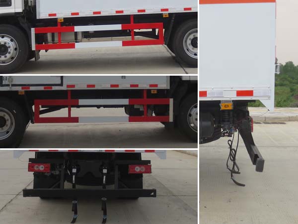| 廂體頂部封閉,不可開(kāi)啟;隨底盤(pán)選裝駕駛室,選裝儲(chǔ)氣筒內(nèi)置;廂體選裝瓦楞板結(jié)構(gòu),廂體側(cè)面選裝開(kāi)門(mén)型式及位置或不帶側(cè)開(kāi)門(mén),選裝百葉窗;選裝起重尾板(收起狀態(tài)水平長(zhǎng)度為290mm),尾板質(zhì)量為450kg;選裝不同廠家尾板及尾板樣式;該車用于運(yùn)輸具有**容器(瓶)包裝的介質(zhì)類項(xiàng)號(hào)為:3;該車為危險(xiǎn)品貨物運(yùn)輸車;僅采用前輪盤(pán)式制動(dòng)器,前置排氣管,子午線輪胎,限速裝置的底盤(pán),限速80km/h;轉(zhuǎn)向輪安裝爆胎應(yīng)急防護(hù)裝置;發(fā)動(dòng)機(jī)/油耗申報(bào)值(L/100km)對(duì)應(yīng)關(guān)系為:F3.8NS6B156/21.02,D30TCIF1/20.39;該車安裝具有衛(wèi)星定位功能的行駛記錄儀;ABS系統(tǒng)型號(hào):ABS-VI.E;生產(chǎn)企業(yè):廣州瑞立科密汽車電子股份有限公司.ABS系統(tǒng)型號(hào):ABS-E;生產(chǎn)企業(yè):威伯科汽車**系統(tǒng)(**)有限公司;側(cè)面防護(hù)及后下部防護(hù)裝置材料材質(zhì):Q235,連接方式:焊接加螺栓連接;后下部防護(hù)裝置斷面尺寸(寬×高):50×100(mm),離地高度:420mm;選裝起重尾板時(shí),后防護(hù)連接方式:焊接加螺栓連接;后下部防護(hù)裝置斷面尺寸為:Φ120mm,離地高度:420mm;該車型可選裝ETC車載裝置. | |||