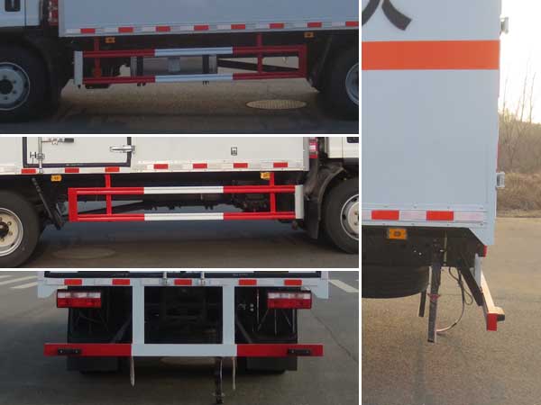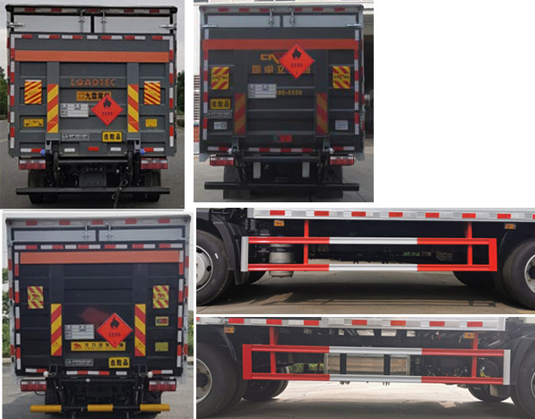 | 廂體頂部封閉,不可開啟;隨底盤選裝駕駛室;選裝底盤附件及油箱左右安裝位置;僅采用底盤3900mm軸距;廂體選裝瓦楞板結(jié)構(gòu),廂體側(cè)面選裝開門型式及位置或不帶側(cè)開門,選裝百葉窗;選裝起重尾板(收起狀態(tài)水平長度為290mm),尾板質(zhì)量為450kg;選裝不同廠家尾板以及尾板外觀;運(yùn)輸介質(zhì)類項(xiàng)號(hào):3;該車為危險(xiǎn)品貨物運(yùn)輸車;僅采用前輪盤式制動(dòng)器,前置排氣管,子午線輪胎,限速裝置的底盤,限速80km/h;轉(zhuǎn)向輪安裝爆胎應(yīng)急防護(hù)裝置;發(fā)動(dòng)機(jī)/油耗申報(bào)值(L/100km)對(duì)應(yīng)關(guān)系為:WP3NQ160E61/20.8,CA4DD1-16E6/20.8;該車安裝具有衛(wèi)星定位功能的行駛記錄儀;ABS生產(chǎn)廠家/型號(hào):1.廣州瑞立科密汽車電子股份有限公司/CM4XL-4S/4M;2.浙江萬安科技股份有限公司/VIE ABS-II;側(cè)面防護(hù)及后下部防護(hù)裝置材料材質(zhì):Q235,連接方式:焊接加螺栓連接;后下部防護(hù)裝置斷面尺寸(寬×高):50×100(mm),離地高度:480mm;選裝起重尾板時(shí),后防護(hù)為圓形結(jié)構(gòu),后下部防護(hù)裝置材料材質(zhì):Q235,連接方式:焊接加螺栓連接;后下部防護(hù)裝置斷面尺寸(直徑):Φ120(mm),離地高度:480mm.該車選裝ETC車載裝置. | |||