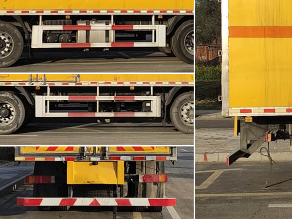 | 廂體頂部封閉,不可開啟;隨底盤選裝駕駛室,隨底盤選裝蓄電池及儲氣筒可選裝右置;選裝廂體開門型式及位置;選裝瓦楞板結(jié)構(gòu)廂體;選裝后部雙拉桿結(jié)構(gòu);選裝起重尾板,尾板質(zhì)量為550kg;起重尾板收起狀態(tài)水平長度為290mm;該車用于運輸具有**容器(瓶)包裝的危險貨物類項號為:9;僅采用前輪盤式制動器,前置排氣管,子午線輪胎,限速裝置的底盤,限速80km/h;后軸為空氣懸架;轉(zhuǎn)向輪安裝爆胎應(yīng)急防護(hù)裝置;該車選裝ETC車載裝置;發(fā)動機/油耗值(L/100km)對應(yīng)關(guān)系為:DDi75E350-60/38.1,L9NS6B400/38.2;該車安裝具有衛(wèi)星定位功能的行駛記錄儀;EBS型號/生產(chǎn)廠家:EBS5/東科克諾爾商用車制動系統(tǒng)(十堰)有限公司;側(cè)面防護(hù)及后下部防護(hù)裝置材料材質(zhì):Q235,連接方式:焊接連接;后下部防護(hù)裝置斷面尺寸(寬×高):60×120(mm),離地高度:495mm;選裝起重尾板時,后防護(hù)結(jié)構(gòu)連接方式:焊接加螺栓連接,斷面尺寸(直徑):Φ120mm,離地高度:460mm. | |||