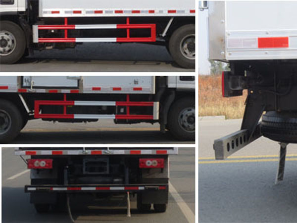 | 廂體頂部封閉,不可開啟;隨底盤選裝駕駛室;廂體選裝瓦楞板結(jié)構(gòu),廂體側(cè)面選裝開門型式及位置或不帶側(cè)開門,選裝百葉窗;選裝起重尾板(收起狀態(tài)水平長(zhǎng)度為290mm),尾板質(zhì)量為450kg;運(yùn)輸**容器(瓶)包裝的危險(xiǎn)貨物類項(xiàng)號(hào)為9;該車為危險(xiǎn)品貨物運(yùn)輸車;僅采用前輪盤式制動(dòng)器,前置排氣管,子午線輪胎,限速裝置的底盤,限速80km/h;轉(zhuǎn)向輪安裝爆胎應(yīng)急防護(hù)裝置;發(fā)動(dòng)機(jī)/油耗申報(bào)值(L/100km)對(duì)應(yīng)關(guān)系為:F3.8NS6B156/16.20,CY4SK261/16.09,D30TCIF1/16.19,F2.8NS6B156/15.39;該車安裝具有衛(wèi)星定位功能的行駛記錄儀;ABS系統(tǒng)型號(hào):ABS-VI.E;生產(chǎn)企業(yè):廣州瑞立科密汽車電子股份有限公司.ABS系統(tǒng)型號(hào):ABS-E;生產(chǎn)企業(yè):威伯科汽車**系統(tǒng)(**)有限公司;側(cè)面防護(hù)及后下部防護(hù)裝置材料材質(zhì):Q235,連接方式:焊接加螺栓連接;后下部防護(hù)裝置斷面尺寸(寬×高):50×100(mm),離地高度:460mm;選裝圓形后防護(hù),連接方式:焊接加螺栓連接;后下部防護(hù)裝置斷面尺寸為:Φ110mm,離地高度:410mm;該車型可選裝ETC車載裝置. | |||