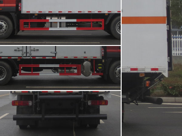 | 車廂頂部封閉不可開啟;EBS型號(hào)廠家:EBS 5/克諾爾制動(dòng)系統(tǒng)(大連)有限公司;安裝有限速裝置;限速裝置限速(km/h):80;安裝有具有衛(wèi)星定位功能的行駛記錄儀;廂體側(cè)面選裝開門型式和位置;選裝瓦楞板結(jié)構(gòu)廂體及開門型式和位置;選裝不帶起重尾板,尾板質(zhì)量為550kg;起重尾板收起狀態(tài)水平長度為290mm;選裝不同廠家尾板以及尾板外觀;該車選裝ETC車載裝置;發(fā)動(dòng)機(jī)/油耗值(L/100km)對(duì)應(yīng)關(guān)系為:F4.5NS6B220/26.28,YCS06245-60A/24.58,YCS04200-68/25.88;整備質(zhì)量(kg)/額定載質(zhì)量(kg)/準(zhǔn)乘人數(shù)(人)對(duì)應(yīng)關(guān)系為:6800/11070/2,6800/11005/3,7150/10720/2,7150/10655/3;側(cè)面防護(hù)及后下部防護(hù)裝置材料材質(zhì):Q235,側(cè)面防護(hù)連接方式:焊接連接;后下部防護(hù)裝置連接方式:焊接加螺栓連接,斷面尺寸(直徑):Φ140mm,離地高度:485mm;選裝不帶尾板時(shí),后下部防護(hù)裝置斷面尺寸(寬×高):60×120(mm),離地高度:485mm;運(yùn)輸**容器(瓶)包裝的貨物;危險(xiǎn)貨物類項(xiàng)號(hào):9;該車為危險(xiǎn)品貨物運(yùn)輸車;僅采用前輪盤式制動(dòng)器,前置排氣管,子午線輪胎;后軸為空氣懸架;轉(zhuǎn)向輪安裝爆胎應(yīng)急防護(hù)裝置; | |||