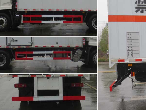| 廂體頂部封閉,不可開啟;隨底盤選裝駕駛室,選裝后處理隔熱罩;廂體側面選裝開門型式及位置或不帶側開門;用于運輸具有**容器(瓶)包裝的:黑火藥,壓縮黑火藥,電(非電)引爆雷管,爆破用,專用煙火制品,無煙火藥,糊狀火藥,爆破炸藥,導爆索,軟的,點燃導火索,射彈,帶有爆炸裝藥,聚能裝藥,不帶雷管,聚能炸藥,不帶雷管,非電引爆雷管組件,爆破用,油井用彈藥筒,固態(tài)推進劑,動力裝置用彈藥筒,商品爆炸裝藥,不帶雷管.運送爆炸品的項號:1.1 D,1.1 D,1.1B,1.1B,1.1G ,1.1C,1.3C,1.1 D,1.1 D,1.4G,1.1D,1.1 D,1.1B,1.1B,1.3C,1.1C,1.3C,1.1D;運送危險貨物車輛的類型:EX/Ⅲ型車輛;僅采用前輪盤式制動器,前置排氣管,子午線輪胎,限速裝置的底盤,限速80km/h;轉向輪安裝爆胎應急防護裝置;后軸采用空氣懸架;發(fā)動機/油耗申報值(L/100km)對應關系為:B6.2NS6B210/25.9,DDi50E190-60/25.9;該車安裝具有衛(wèi)星定位功能的行駛記錄儀;EBS型號/生產(chǎn)廠家:EBS5/東科克諾爾商用車制動系統(tǒng)(十堰)有限公司;側面防護及后下部防護裝置材料材質:Q235,連接方式:焊接加螺栓連接;后下部防護裝置斷面尺寸(寬×高):50×120(mm),離地高度:495mm. | |||