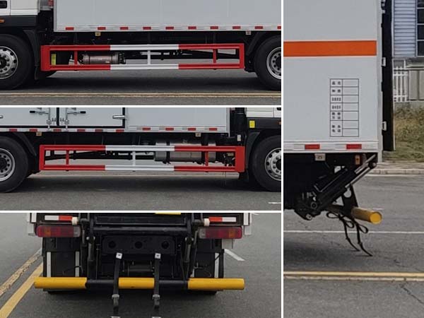 | 車廂頂部封閉不可開啟;EBS系統(tǒng)型號/生產(chǎn)企業(yè):EBS 5/克諾爾制動系統(tǒng)(大連)有限公司;安裝有限速裝置,限速裝置限速(km/h):80;安裝有具有衛(wèi)星定位功能的行駛記錄儀;隨底盤選裝駕駛室;隨底盤選裝燃油箱,電瓶,尿素罐,儲氣筒左右安裝位置;選裝廂體開門型式及位置;選裝后部結(jié)構(gòu);起重尾板為選裝件(收起狀態(tài)水平長度為290mm),尾板質(zhì)量為550kg;該車選裝直接供電ETC車載裝置;發(fā)動機(jī)/油耗申報值(L/100km)對應(yīng)關(guān)系為:F4.5NS6B220/24.4,B6.2NS6B210/26.0;側(cè)面防護(hù)及后下部防護(hù)裝置材料材質(zhì):Q235,側(cè)面防護(hù)連接方式:焊接連接;后下部防護(hù)裝置連接方式:焊接加螺栓連接,斷面尺寸(直徑):Φ120(mm),離地高度:440mm;不帶起重尾板時,后防護(hù)連接方式:焊接加螺栓連接;后下部防護(hù)裝置斷面尺寸(寬×高):50×120(mm),離地高度:480mm;運輸**容器(瓶)包裝的介質(zhì)類項號為:1.1 D,1.1B,1.1G ,1.1C,1.3C,1.4G;運送危險貨物車輛的類型:EX/Ⅲ型車輛;僅采用前輪盤式制動器,前置排氣管,子午線輪胎;轉(zhuǎn)向輪安裝爆胎應(yīng)急防護(hù)裝置;后軸采用空氣懸架. | |||