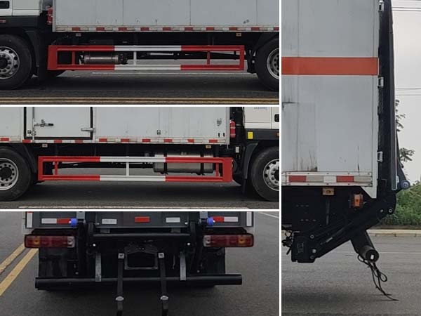| 車廂頂部封閉不可開啟;EBS系統(tǒng)型號(hào)/生產(chǎn)企業(yè):EBS 5/克諾爾制動(dòng)系統(tǒng)(大連)有限公司;安裝有限速裝置,限速裝置限速(km/h):80;安裝有具有衛(wèi)星定位功能的行駛記錄儀;隨底盤選裝駕駛室;隨底盤選裝左右附件及油箱安裝位置;選裝廂體開門型式及位置;選裝瓦楞板結(jié)構(gòu)廂體;選裝后部結(jié)構(gòu);起重尾板為選裝件(收起狀態(tài)水平長度為290mm),尾板質(zhì)量為550kg;選裝不同廠家尾板以及尾板外觀;該車選裝ETC車載裝置;發(fā)動(dòng)機(jī)/油耗申報(bào)值(L/100km)對(duì)應(yīng)關(guān)系為:F4.5NS6B220/24.4,B6.2NS6B210/26.0;側(cè)面防護(hù)及后下部防護(hù)裝置材料材質(zhì):Q235,側(cè)面防護(hù)連接方式:焊接連接;后下部防護(hù)裝置連接方式:焊接加螺栓連接,斷面尺寸(直徑):Φ120(mm),離地高度:480mm;不帶起重尾板時(shí),后防護(hù)連接方式:焊接加螺栓連接;后下部防護(hù)裝置斷面尺寸(寬×高):50×120(mm),離地高度:480mm;運(yùn)輸**容器(瓶)包裝的介質(zhì)類項(xiàng)號(hào)為:2.1,2.2;該車為危險(xiǎn)品貨物運(yùn)輸車;僅采用前輪盤式制動(dòng)器,前置排氣管,子午線輪胎;轉(zhuǎn)向輪安裝爆胎應(yīng)急防護(hù)裝置;后軸采用空氣懸架. | |||